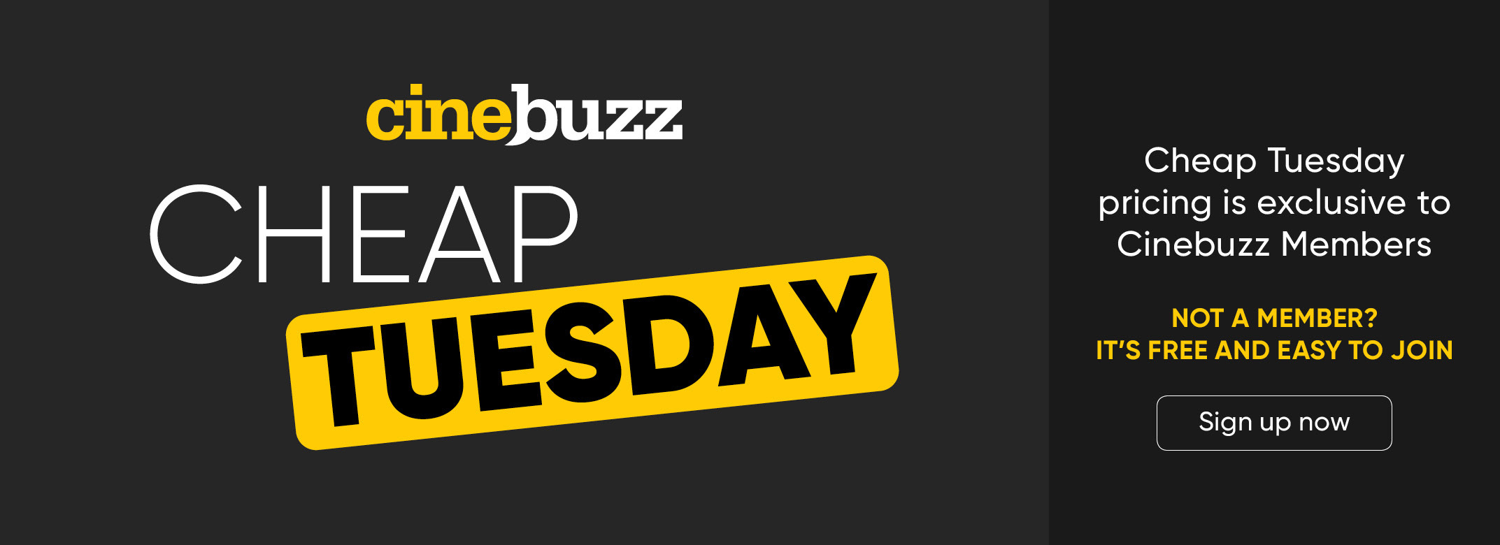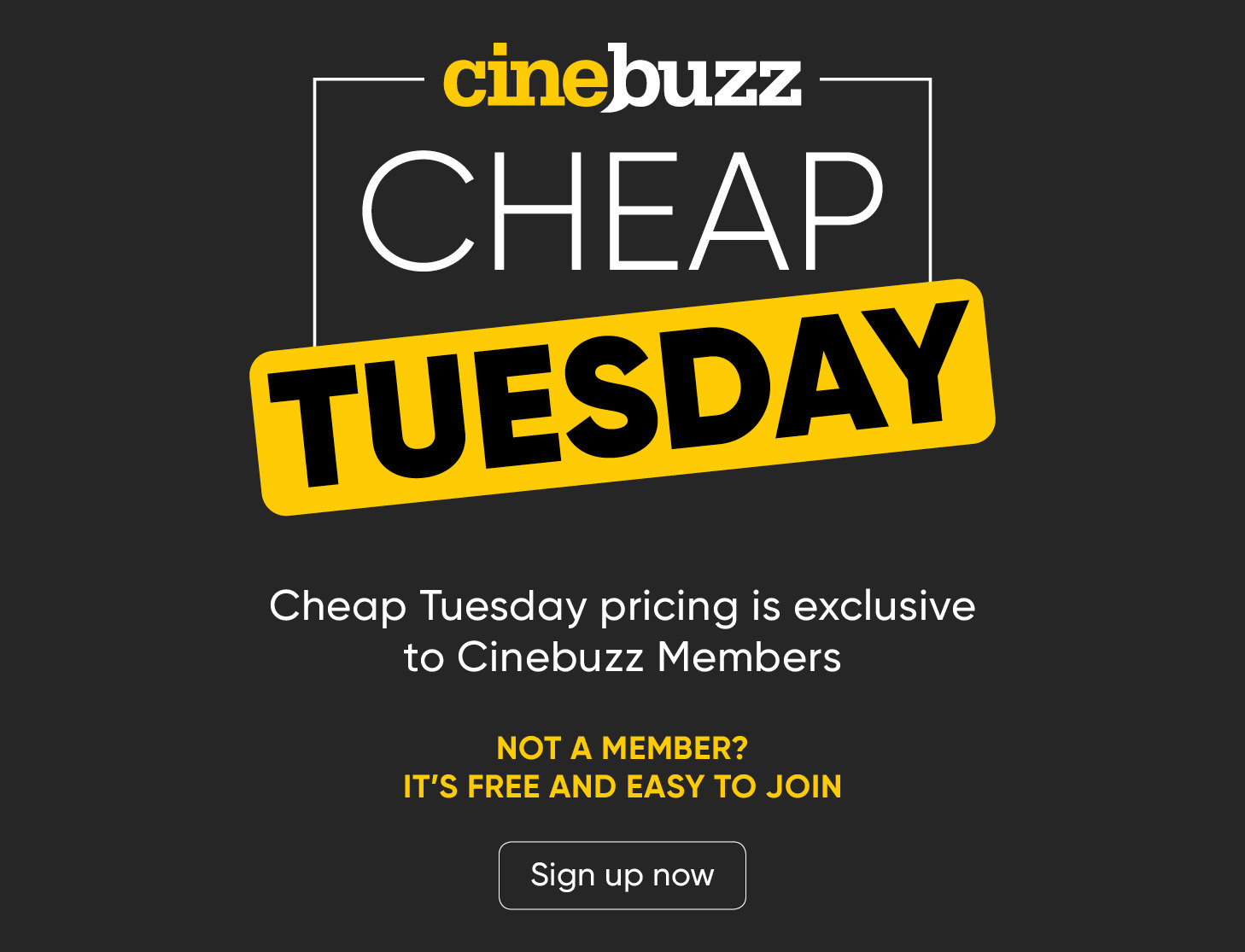 *To receive the Cinebuzz Cheap Tuesday ticket price you must be a member of Cinebuzz Rewards and be logged into your account at time of ticket purchase. For in-cinema purchase you must swipe your Cinebuzz card. Cheap Tuesday pricing not valid in IMAX, Gold Class, Boutique, Platinum or Premium seating options, Festivals and special screenings.